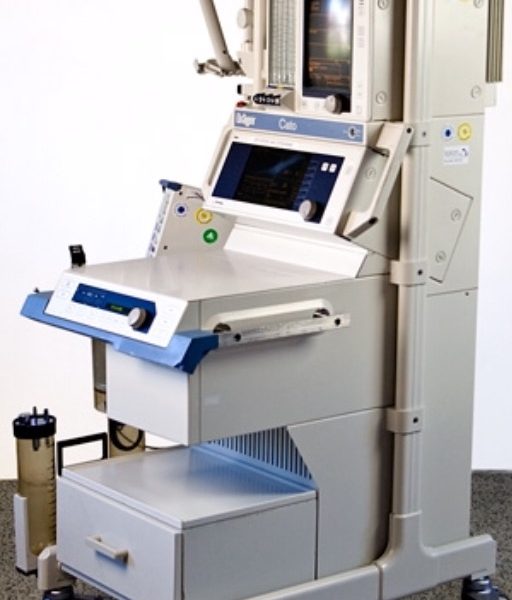 Mobile anaesthesia workstation for automatic ventilation (IPPV), synchronised, intermittent, mandatory ventilation (SIMV), manual ventilation and spontaneous ventilation.